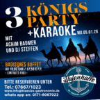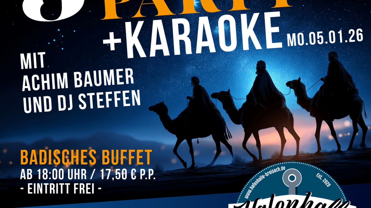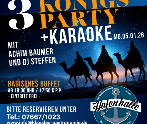 Kläsle's Hafenhalle lädt ein zur 3 Königsparty und Karaoke mit Achim Bauer, Matthias und DJ Steffen sowie badischem Buffet ab 18 Uhr. Kläsle's Hafenhalle lädt am Montag, 05.01.2026 ab 18 Uhr zur 3 Königsparty und Karaoke mit Achim Bauer, Matthias und DJ Steffen sowie badischem Buffet ab 18 Uhr. Eintritt frei. Preis für das Buffet: 17,50 € pro Person. Bitte reservieren unter Tel: 07667/1023 oder per WhatsApp an: 0171/8067022 oder per Email: www.info@klaesles-gastronomie.de