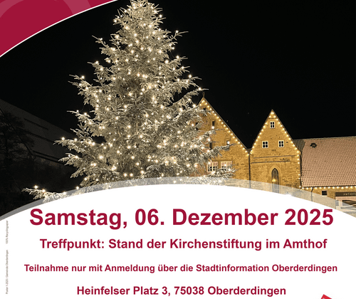 Auch in diesem Jahr findet wieder traditionell am 2. Adventswochenende der Oberderdinger Weihnachtsmarkt statt. Der historische Amthof zwischen Rathaus, Amthof12 WG Oberderdingen-Knittlingen e. G., dem Gewölbekeller sowie dem evangelischen Gemeindehaus verwandelt sich drei Tage lang von Freitag, 05. bis Sonntag, 07. Dezember 2025 in eine stimmungsvoll beleuchtete Weihnachtslandschaft. Ein buntes Programm auf der Amthofbühne lädt zum Verweilen ein. In das feine Format „Weihnachten im Amthof“ wird zum 2. Adventswochenende der Oberderdinger Weihnachtsmarkt integriert. Der Amthof beim Rathaus wird stimmungsvoll beleuchtet und eine besondere Atmosphäre der ehemals klösterlichen Anlage wird geschaffen. Bis zum 22. Dezember, der Sonntag vor Heiligabend, lädt die Aktion „Weihnachten im Amthof“ Groß und Klein in den Amthof ein. Nach dem Weihnachtsmarktwochenende sind die Oberderdinger Weingüter und Weinbaubetriebe jeweils donnerstags bis samstags im Amthof vor Ort von 17.00 Uhr – 21.00 Uhr. Bürgermeister Thomas Nowitzki eröffnet den 38. Oberderdinger Weihnachtsmarkt am Freitag, 05. Dezember 2025 um 18.00 Uhr auf der Amthofbühne, musikalisch umrahmt durch die Kindertagesstätte IdeenReich und den Musikverein Oberderdingen. Im Anschluss um 19.00 Uhr präsentiert die Leopold-Feigenbutz-Realschule ein abwechslungsreiches Programm. Zum Abschluss dieses musikalischen Abends spielt ab 20.00 Uhr der Posaunenchor Oberderdingen-Sternenfels, der mit festlichen Stücken die Besucher in die Adventszeit begleitet und den ersten Abend des Weihnachtsmarktes klangvoll ausklingen lässt. Rund 30 Aussteller präsentieren in diesem Jahr drei Tage lang ihre kunsthandwerklichen Arbeiten im Rathaus, Gewölbekeller sowie im Außenbereich. Im historischen Amthof, der mit vielen Lichtern geschmückt ist, befinden sich zahlreiche Stände und laden mit Glühwein und weihnachtlichen Speisen zum Verweilen ein. Die evangelische Verbundkirchengemeinde ist mit einem Stand der Stiftung "Denk(mal) für die Zukunft" vertreten. Im evangelischen Gemeindehaus bietet die evangelische Verbundkirchengemeinde am Sonntag auch gefüllte Kalbsbrust mit Spätzle, Semmelknödel mit Pilzragout sowie Kaffee und Kuchen an. Auf der Amthofbühne gibt es über das gesamte Wochenende ein buntes Programm, gestaltet durch den Musikverein Oberderdingen, den Posaunenchor Oberderdingen-Sternenfels, die Kindertagesstätte IdeenReich und die Schneckenhäuser Bremichstraße, Torwächterhaus, Rudi, Waldkindergarten, die Strombergschule Oberderdingen, die Leopold-Feigenbutz-Realschule, der Tanzschule Floris Pfeifer sowie den Kindergärten Strombergigel und Lindenplatz. Am Samstagabend, 06. Dezember 2025 erwartet die Besucher und Besucherinnen um 16.00 Uhr ein Auftritt des Kindergartens Lindenplatz, dessen Kinder mit fröhlichen Liedern und viel Begeisterung die Weihnachtszeit einleiten. Direkt im Anschluss um 16.30 Uhr folgt der Kindergarten Strombergigel mit weiteren fleißig einstudierten Beiträgen. Um 17 Uhr übernimmt die Tanzschule Floris Pfeifer die Bühne und begeistert mit schwungvollen Tanzdarbietungen die festliche Stimmung. Ab 18.30 Uhr wird die Strombergschule mit musikalischen Beiträgen zum Bühnenprogramm beitragen. Gegen 19.45 Uhr singt und spielt Solokünstler Uwe Halmich auf der Amthofbühne. Besinnliche Weihnachtsführung Durch das historische Amthof-Ensemble bietet sich am Samstagnachmittag, 06. Dezember 2025 die Möglichkeit eines stimmungsvollen Adventsrundgangs im Amthof mit dem Stadtführer Markus Deutsch. Treffpunkt des besinnlichen Adventsrundgangs ist der Stand der Evangelischen Kirchengemeinde im Amthof um 17.00 Uhr. Zur Einstimmung erhalten die Teilnehmenden einen Becher Punsch oder Glühwein, bevor gemeinsam die mittelalterlichen Gebäude besichtigt werden. Im Glockenturm liest Stadtführer Markus Deutsch eine Weihnachtsgeschichte aus seinem eigenen Weihnachtsbuch. Zum Abschluss kehrt die Gruppe erneut zu einem warmen Getränk zurück. Der Rundgang kostet 12 Euro pro Person. Eine Anmeldung ist erforderlich und kann über die Stadtinfo Oberderdingen erfolgen. Die Plätze sind begrenzt. Zudem erwartet die Besucher des Oberderdinger Weihnachtsmarkts am Samstag, den 06. Dezember 2025, um 19.00 Uhr, ein ganz besonderes Highlight. In der evangelischen Laurentiuskirche im historischen Amthof findet das diesjährige Adventskonzert für Trompete und Orgel statt. Auf der frisch sanierten Orgel werden die Solisten Marc Bühler und Timo Handschuh ein festliches Programm mit Werker barocker Meister präsentieren und die Zuhörer auf die bevorstehende Weihnachtszeit einstimmen. Das Adventskonzert verspricht ein unvergessliches musikalisches Erlebnis zu werden. Tickets sind an der Abendkasse für 15 Euro erhältlich (SchülerInnen frei). Am Sonntag, den 07. Dezember 2025, startet das Bühnenprogramm um 14.00 Uhr mit den Kindern aus allen Schneckenhäusern. Mit einem Live-Konzert mit Thomas Rothfuß wird der letzte Tag des Weihnachtsmarktes 2025 musikalisch ausklingen. Auch der Nikolaus lässt dieses Jahr wieder Kinderaugen strahlen, in dem er an allen drei Tagen kleine Geschenke an die Kinder verteilt. In der Spielscheune Oberderdingen hat die AWO am Samstag, 06. Dezember 2025 von 14.30 Uhr bis 18.30 Uhr und am Sonntag, 07. Dezember 2025 von 11.00 Uhr – 17.00 Uhr geöffnet und bietet ein tolles Angebot an. Die Stadt Oberderdingen lädt Sie herzlich zum Schlemmen, Bummeln und Genießen auf den 38. Oberderdinger Weihnachtsmarkt ein. Wir freuen uns auf Ihren Besuch! Öffnungszeiten Weihnachtsmarkt Oberderdingen: Freitag, 05. Dezember 2025 von 18.00 Uhr – 21.00 Uhr Samstag, 06. Dezember 2025 von 16.00 Uhr – 22.00 Uhr (Schließzeit Großer Ratssaal und Gewölbekeller 21.00 Uhr) Sonntag, 07. Dezember 2025 von 11.00 Uhr – 18.00 Uhr Das Aschingerhaus ist geöffnet ! Das Aschingerhaus hat am Samstag, 06. und Sonntag, 07. Dezember 2025 von 14.00 Uhr – 17.00 Uhr geöffnet. An beiden Tagen werden die Künstlerinnen und Künst