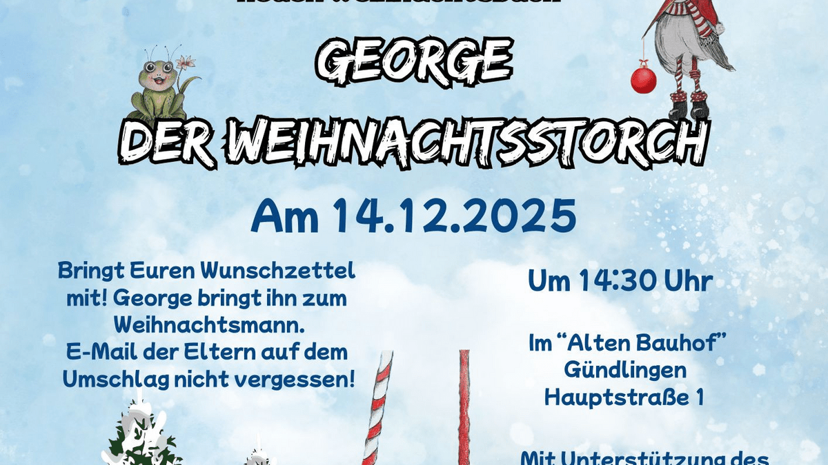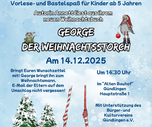 Die Autorin Annett Bucherer liest aus ihrem neuen Weihnachtsbuch - Georg der Weihnachtsstorch - Vorlese- und Bastelspaß für Kinder ab 5 Jahren. Der Bürger- und Kulturverein Gündlingen e.V. lädt am Sonntag, 14.12.2025 um 14:30 Uhr , in den „Alten Bauhof“ hinterm Rathaus in Gündlingen, zum Vorlese- und Bastelspaß für Kinder ab 5 Jahren ein. Die Kinderbuchtautorin Annett liest , begleitet durch Bilder auf einer Leinwand, aus ihrem neuen Weihnachtsbuch „George der Weihnachtsstorch“ vor . Im Anschluss gibt’s für die Kinder einen kleinen Bastelspaß. Die Bücher können signiert erworben werden. Es besteht die Möglichkeit, für die Kinder, Ihre Wunschzettel für den Weihnachtsmann in einen Postkasten zu werfen, die dann, bei Angaben einer E-Mail-Adresse, an die Eltern weitergeleitet werden. Die Veranstaltung dauert ca. 1,5 bis 2 Stunden. Eintritt frei, keine Anmeldung erforderlich. Der Bürgerverein bietet den Kindern eine kleine Erfrischung an, für die Erwachsenen stehen Kaffee und Kuchen auf Spendenbasis bereit. Im Anschluss empfiehlt der Bürgerverein, das Weihnachtsdorf der Freiwilligen Feuerwehr in Gündlingen, für einen gemütlichen Ausklang des Sonntags, zu besuchen.