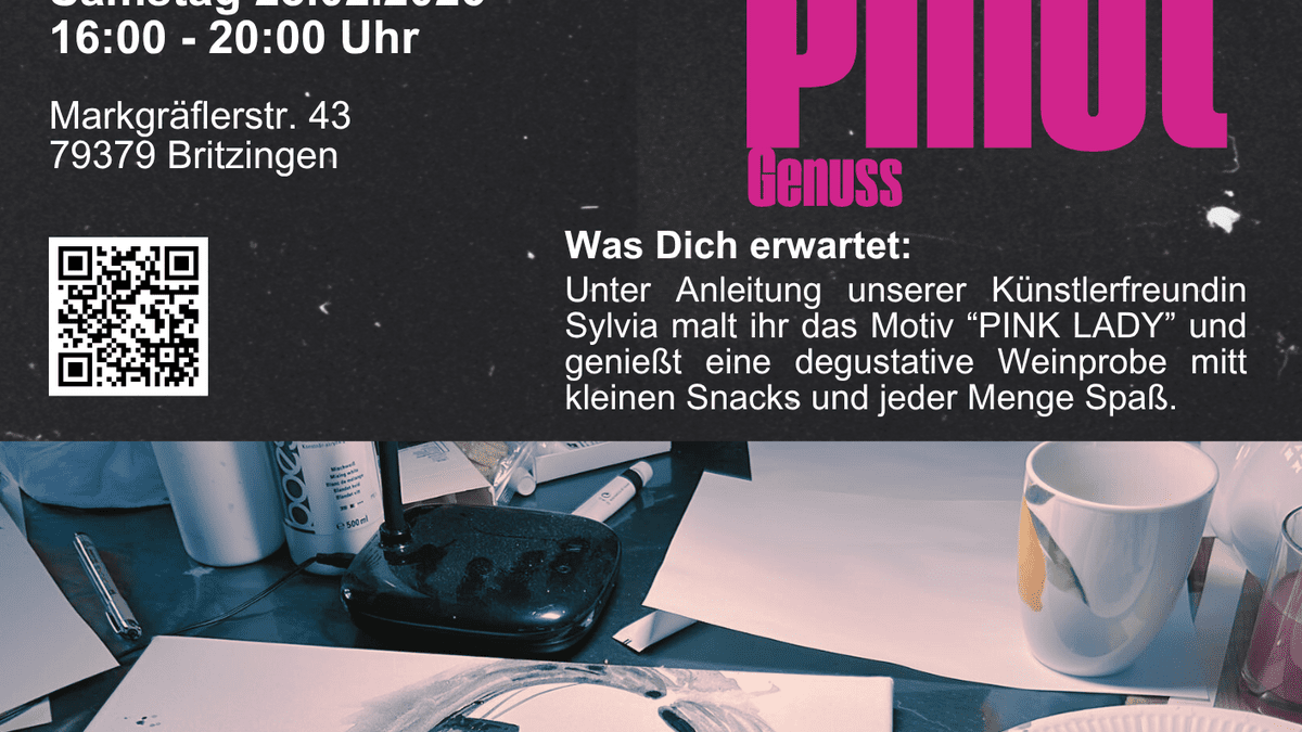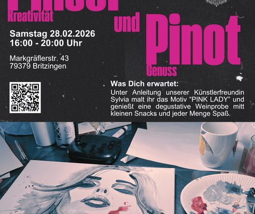 Taucht ein in einen genussvollen Nachmittag voller Farbe, Inspiration und Wein! Gemeinsam mit unserer Künstlerfreundin Sylvia erschafft ihr euer eigenes Kunstwerk – das elegante Motiv „Pink Lady“ – Schritt für Schritt und ganz ohne Vorkenntnisse. Während ihr malt, dürft ihr ausgewählte Weine vom Weingut Behringer verkosten und euch an feinen Snacks erfreuen. In entspannter Atmosphäre entstehen Kunstwerke, Gespräche und viele schöne Momente.