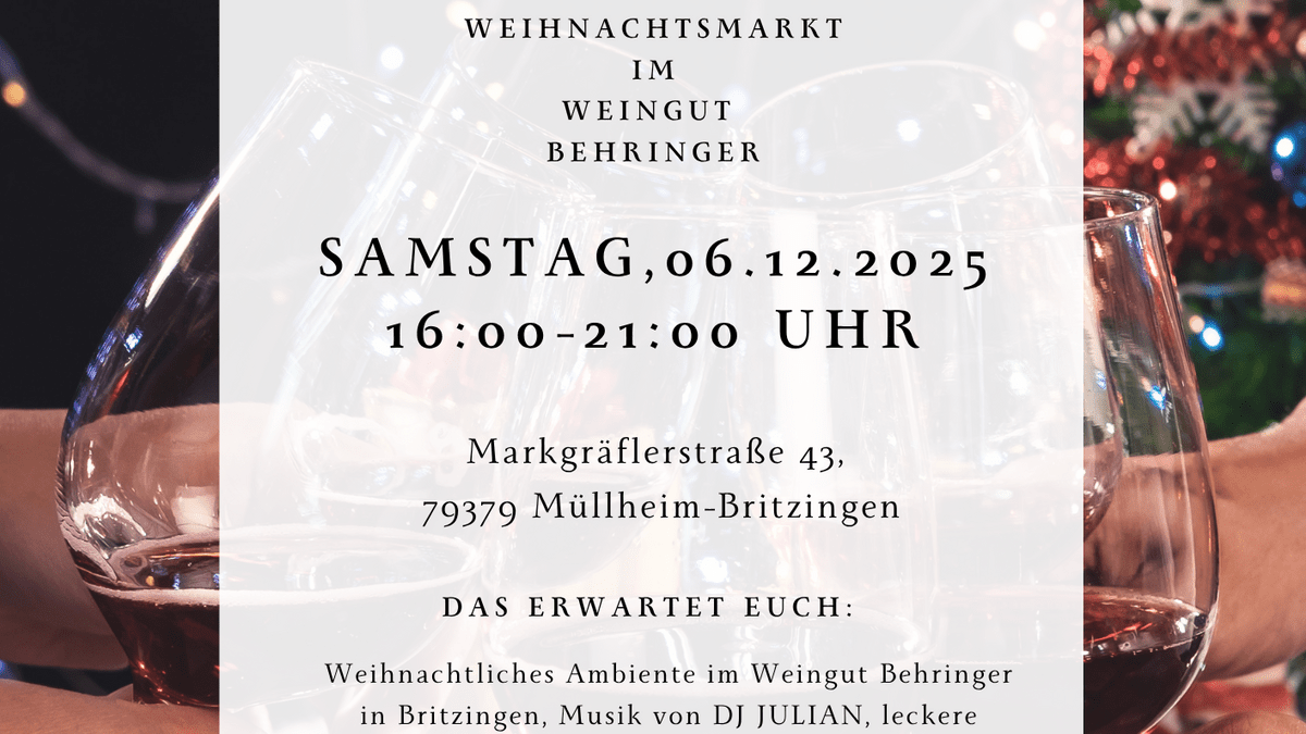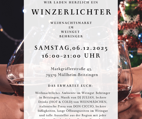 Weihnachtliches Ambiente im Weingut Behringer in Britzingen, Musik, leckere Drinks (HOT & COLD) von WEINMÄDCHEN, italienische Pinsa von DON CICCIO, leckere Süßigkeiten, lange Öffnungszeiten im Weingut und tolle Aussteller aus der Region mit jeder Menge Geschenkideen, Kränzen, Gestecken, Selbstgebackenem, Holzdeko, Schmuck, Weihnachtslichter u.v.m.