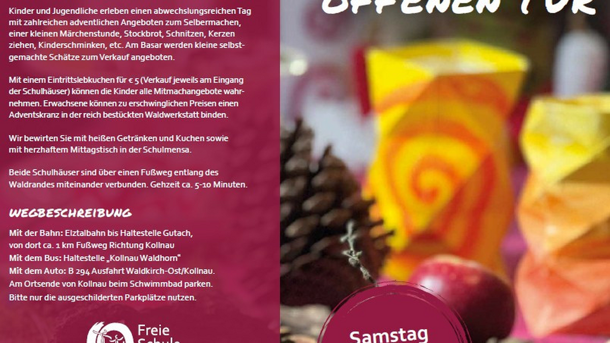Am Samstag, 22. November von 11 bis 16 Uhr laden wir alle Interessierten herzlich ein, unsere Schule sowie die Kindergartengruppen kennenzulernen. Erleben Sie mit Ihren Kindern, wie wir nach den Prinzipien der Waldorfpädagogik lernen, leben und wachsen – mit viel Raum für Kreativität, Gemeinschaft und individuelle Entwicklung. Verbringen Sie einen abwechslungsreichen, adventlichen Familientag bei uns: - außergewöhnliche Mitmachangebote für Kinder, z. B. Schnitzen, Kerzen ziehen, Besuch in der Edelsteingrotte, Kunstwerkstatt, adventliches Basteln, Naturwissenschaften erleben, Kinderschminken, Märchenstube, Waldwerkstatt im Adlersaal - Informationen für Eltern von Kindergartenkindern, angehenden Schulkindern sowie für Eltern, die einen Schulwechsel für ihr Kind in Betracht ziehen - Kunsthandwerkbasar mit kleinen, selbstgemachte Schätze zu erschwinglichen Preisen - Kulinarische Angebote wie Kuchen & Waffeln, Stockbrot und Punsch sowie warmen Mittagstisch in der Schulmensa Wir freuen uns auf ihren Besuch: Schulhaus Maxhaus | Maxhausweg 4| 79183 Waldkirch Schulhaus Adler | Landstr. 6 | 79261 Gutach im Breisgau Beide Schulhäuser sind über einen Fußweg entlang des Waldrandes miteinander verbunden. Gehzeit ca. 5-10 Minuten. Bitte kommen Sie mit dem Rad oder den öffentlichen Verkehrsmitteln, es gibt keine Parkmöglichkeit direkt an den Schulhäusern.