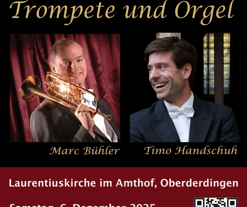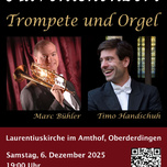 Marc Bühler und Timo Handschuh zu Gast in Oberderdingen: Adventskonzert in der Laurentiuskirche Am Samstag, den 6. Dezember 2025, um 19:00 Uhr, erwartet die Besucher des Oberderdinger Weihnachtsmarkt ein ganz besonderes Highlight: In der evangelischen Laurentiuskirche im historischen Amthof findet das diesjährige Konzert für Trompete und Orgel statt. Auf der frisch sanierten Orgel werden die Solisten Marc Bühler und Timo Handschuh ein festliches Programm mit Werken barocker Meister präsentieren und die Zuhörer auf die bevorstehende Weihnachtszeit einstimmen. Die Oberderdinger Konzertreihe hat sich über die Jahre einen hervorragenden Ruf erarbeitet und ist bei Musikliebhabern und Kennern bekannt und beliebt. Das Adventskonzert verspricht ein unvergessliches musikalisches Erlebnis zu werden. Tickets sind an der Abendkasse für 15 Euro erhältlich. Schüler innen: kostenlos Weitere Infos zu den Solisten unter https://www.marcbuehler.de Marc Bühler wurde 1976 in Bretten geboren. Er studierte Trompete an der Musikhochschule Stuttgart bei Prof. Wolfgang Bauer und besuchte Meisterkurse bei German Brass und Prof. Hannes Läubin. Marc Bühler ist freiberuflicher Trompetensolist und konzertiert rege im In‐ und Ausland. Er tritt als Gastsolist in verschiedenen Orchesterformationen und Kammermusikbesetzungen in Erscheinung. Konzertreisen führten ihn durch Norwegen, Finnland, Ungarn und Österreich. Außerdem wirkte er bereits bei vielen CD‐ und Rundfunkaufnahmen mit. Seit Oktober 2006 ist Marc Bühler Dozent an der Pädagogischen Hochschule in Karlsruhe in den Fächern Trompete und Bläserkammermusik. 2009 erfolgte die Aufnahme in „Das große Buch der Trompete Band 2“ des international renommierten SCHOTT‐Musikverlages. Timo Handschuh wurde in Lahr / Schwarzwald geboren, lehrt seit 2023 als Professor für Dirigieren an der Hochschule für Musik und Tanz in Köln. 2025 wurde er zum geschäftsführenden Direktor am Standort Aachen ernannt. Er war von 2011 bis 2021 Generalmusikdirektor der Stadt Ulm, von 2013 bis 2019 gleichzeitig Chefdirigent und Künstlerischer Leiter des Südwestdeutschen Kammerorchesters in Pforzheim. Ausgebildet an der renommierten Staatsoper Stuttgart durchlief er dort alle Stationen vom Korrepetitor, Kapellmeister und Assistenten des damaligen GMD Manfred Honeck. Dort leitete er über 120 Vorstellungen von großen Opern wie DER FREISCHÜTZ, AIDA, MADAMA BUTTERFLY, LOHENGRIN, EUGEN ONEGIN und DER ROSENKAVALIER. Als Dirigent steht Timo Handschuh am Pult verschiedenster Orchester und tritt bei Festivals und Gastspielen im In‐ und Ausland auf, insgesamt ist er mit 15 verschiedenen CD‐Aufnahmen präsent. Seine Liebe zur sakralen Musik erfuhr ihre Initialzündung im Orgel‐ und Kirchenmusikstudium, welches Timo Handschuh mit dem A‐Examen bei Prof. Dr. Ludger Lohmann 2001 abschloss. Im Ulmer Münster brachte er ab dem Jahr 2014 einen vielbeachteten BRUCKNER‐ZYKLUS mit den späten Sinfonien des Wiener Meisters heraus. Für Chöre mit Orchester komponierte er Werke unterschiedlichster Couleur, wie die MESSA SUBLIME AMORE (2016), MESSA FEDE RAGGIANTE (2018), sein MAGNIFICAT (2021) sowie VENI CREATOR SPIRITUS (2023) und RESTA CON NOI (2024)