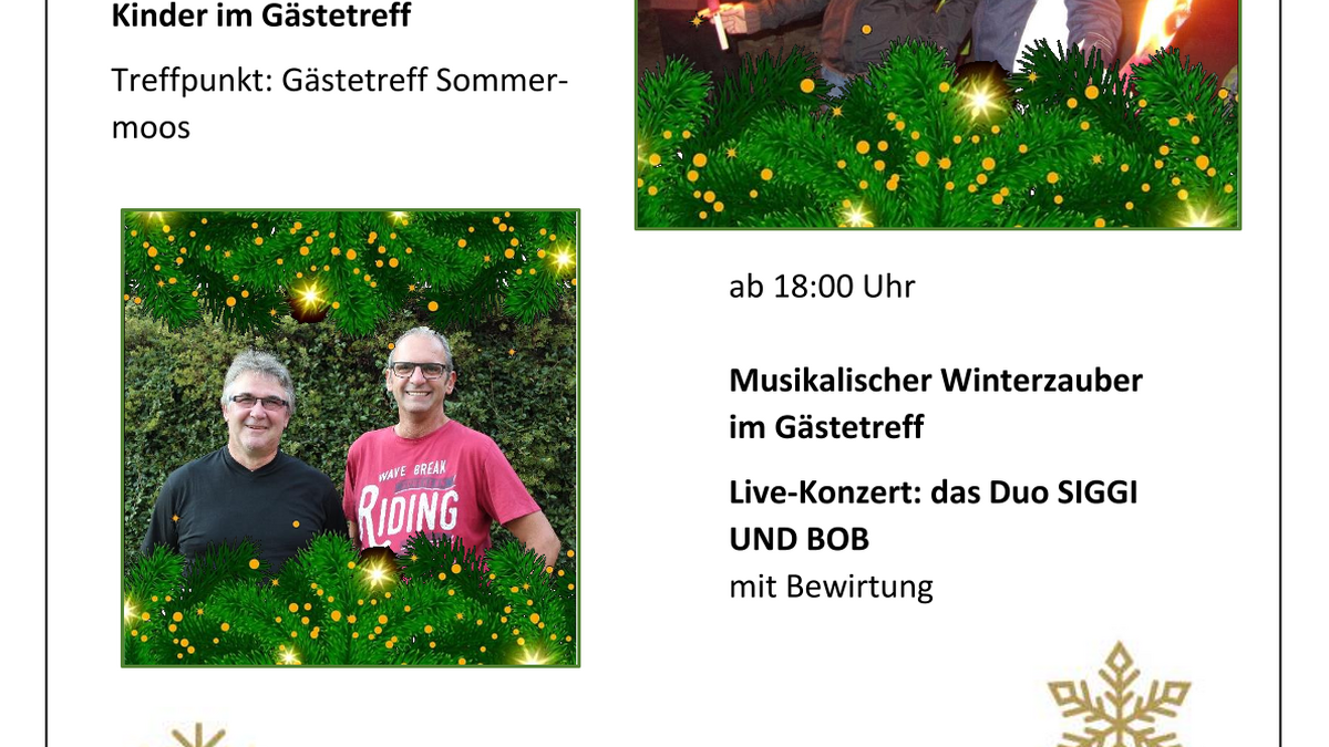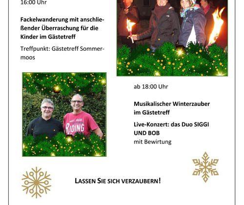 Erleben Sie einen stimmungsvollen Winterabend voller Musik und Überraschungen! Ab 16:00 Uhr beginnt das Kinderprogramm mit einer Fackelwanderung, gefolgt von einer kleinen Überraschung im Gästetreff Sommermoos. Ab 18:00 Uhr sorgt das Duo Siggi & Bob live für beste musikalische Unterhaltung, während Sie sich bei Getränken und Snacks verwöhnen lassen können. Ein wunderbarer Abend für die ganze Familie, um den Winter in vollen Zügen zu genießen!