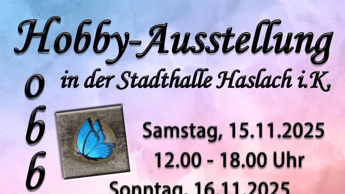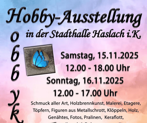 Künstler aus Haslach und der Umgebung präsentieren zwei Tage lang ihre Werke und zeigen dabei, wie man die Freizeit kreativ gestalten kann.Das künstlerische Event findet traditionell am Volkstrauertag-Wochenende, 16. und 17. November in der Stadthalle Haslach statt. Wir haben Schmuck, Figuren aus Metallschrott, Malerei, Etagere, Upsycling, Töpfern, Holzschmuck, Beton, Holz, Makramee, weihnachtl. Deko, uvm.! Für die Besucher gibt es wieder Kaffee und selbstgemachte Kuchen in großer Auswahl (auch zum Mitnehmen). Auch warme Wiener mit Brot sind im Angebot. Natürlich haben wir auch wieder eine Malecke für die Jüngsten unter uns. Der Erlös aus Bewirtung und Bücherflohmarkt, geht an das Akkordeon-Orchester, die uns bei der Bewirtung unterstützen. Öffnungszeiten der Ausstellung: Samstag, 16. November von 12.00 - 18.00 Uhr Sonntag, 17. November von 12.00 - 17.00 Uhr