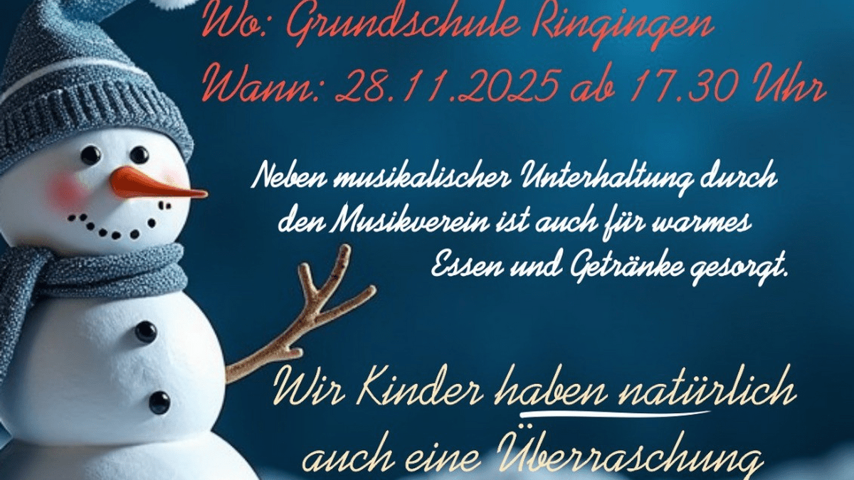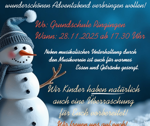 Adventsschulhof Ringingen Adventsschulhof in Ringingen für Eltern, Geschwister, Omas und Opas, Verwandte und alle, die einen wunderschönen Adventsabend verbringen wollen. Es gibt musikalische Unterhaltung durch den Musikverein sowie Essen und Getränke. Außerdem haben die Kinder für die Gäste noch eine Überraschung vorbereitet.