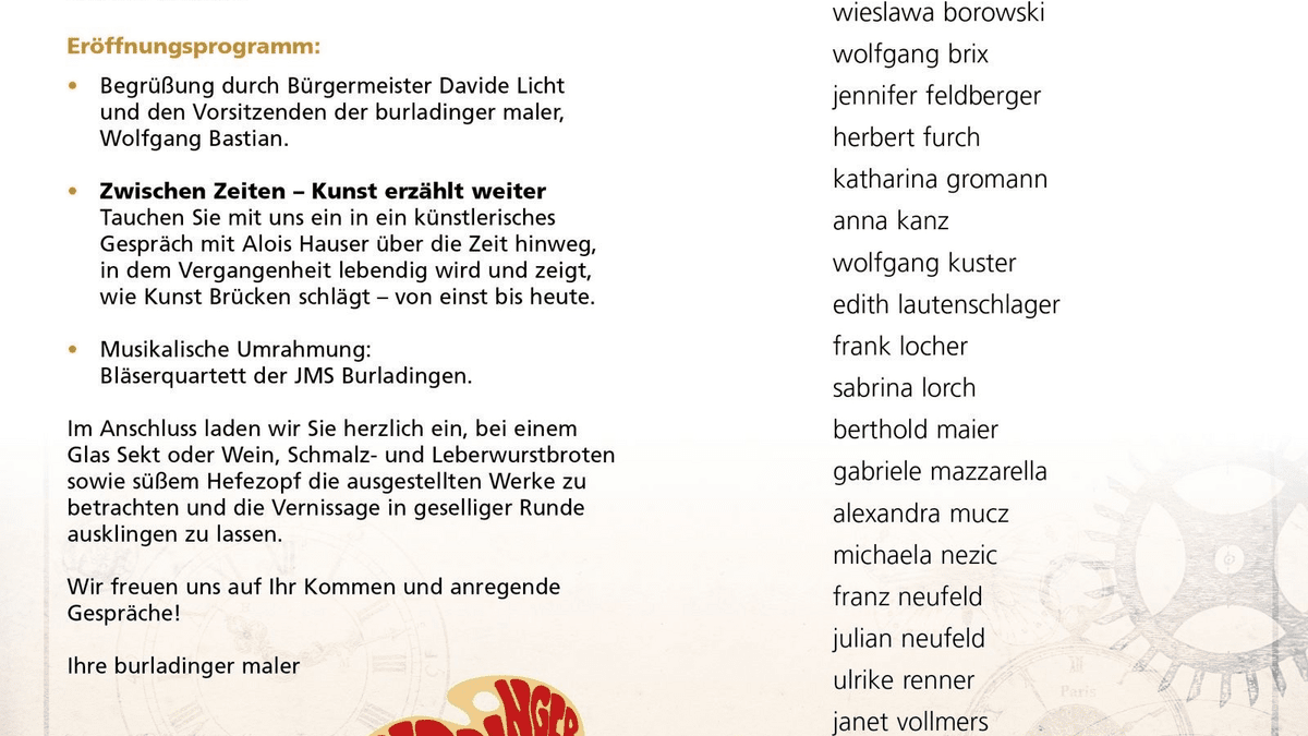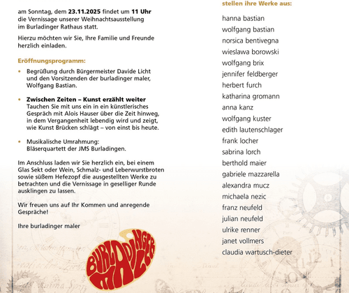 Vernissage der Burladinger Maler Am Sonntag, dem 23.11.2025 findet um 11 Uhr die Vernissage unserer Weihnachtsausstellung im Burladinger Rathaus statt. Eröffnungsprogramm: • Begrüßung durch Bürgermeister Davide Licht und den Vorsitzenden der burladinger maler, Wolfgang Bastian. • Zwischen Zeiten - Kunst erzählt weiter Tauche Sie mit uns ein in ein künstlerisches Gespräch mit Alois Hauser über die Zeit hinweg, in dem Vergangenheit lebendig wird und zeigt, wie Kunst Brücken schlägt - von eins bis heute. • Musikalisch Umrahmung: Bläserquartett der JMS Burladingen. Im Anschluss laden wir Sie herzlich ein, bei einem Gals Sekt oder Wein, Schmalz- und Leberwurstbroten sowie süßem Hefezopf die ausgestellten Werke zu betrachten und die Vernissage in geselliger Runde ausklingen zu lassen.