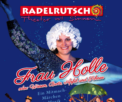 Das Theater RADELRUTSCH lädt Euch ein zu einer märchenhaft musikalischen Mitspielreise in das Natur Reich von Frau Holle. Setzt mit dem Mädchen Marie das Spinnrad in Schwung, freut euch an der blühenden Blumenwiese, holt die knusprigen Brote aus dem Backofen, schüttelt die reifen knackigen Äpfel vom Baum und lasst die federweißen Schneeflocken wirbeln. Frau Holle oder Wiesen, Brote, Äpfel und Schnee Wir laden Euch ein zu einer märchenhaft musikalischen Mitspielreise in das Natur Reich von Frau Holle. Setzt mit dem Mädchen Marie das Spinnrad in Schwung, freut euch an der blühenden Blumenwiese, holt die knusprigen Brote aus dem Backofen, schüttelt die reifen knackigen Äpfel vom Baum und lasst die federweißen Schneeflocken wirbeln. Lauscht, singt und bewegt euch zur wundervollen Musik und erlebt das spannende fantastische Theater-Abenteuer von Goldmarie und Pechmarie, dem Hahn Kikeriki und dem Großen Zaubertor aus dem es GOLD regnet oder gar PECH?