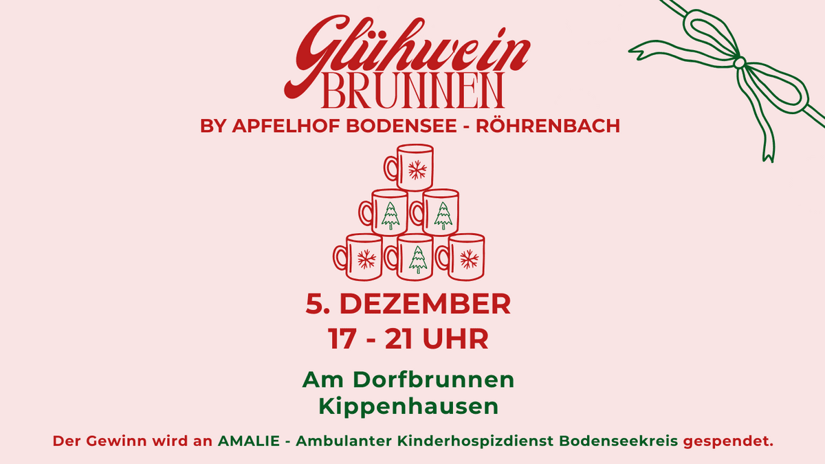 **Am 5. Dezember von 17–21 Uhr** lädt der Apfelhof Bodensee zum **Glühweinbrunnen** am Dorfbrunnen Kippenhausen ein. Mit Glühwein, Apfelpunsch, Destillat-Bar und Wintereintopf. Der Gewinn geht an AMALIE, den ambulanten Kinderhospizdienst Bodenseekreis. **Der Apfelhof Bodensee lädt am 5. Dezember von 17 bis 21 Uhr herzlich zum Glühweinbrunnen am Dorfbrunnen in Kippenhausen ein –** ein vorweihnachtliches Zusammenkommen für Einheimische und Gäste. Es gibt **wärmenden Glühwein vom Winzerverein Hagnau**, aromatischen **Apfelpunsch**, eine feine **Destillat-Bar** sowie herzhaften **Wintereintopf mit Brot** vom Apfelhof Bodensee und Obsthof Ragg. Euch erwarten festliche Lichter, weihnachtliche Musik und eine gemütliche Atmosphäre, in der man sich austauschen und gemeinsam die Adventszeit genießen kann. ** Der gesamte Gewinn kommt **AMALIE – dem ambulanten Kinderhospizdienst Bodenseekreis –** zugute. Ein Abend voller Genuss, Gemeinschaft und gelebter Vorweihnachtsfreude – für einen guten Zweck.