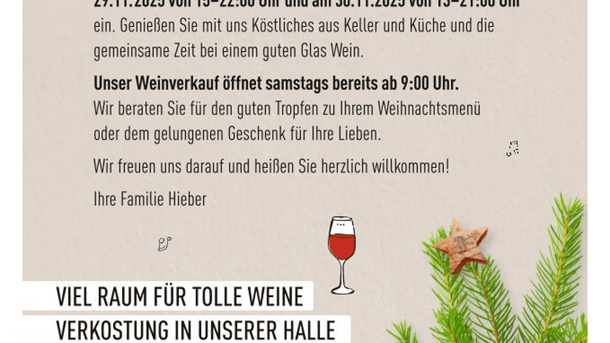 Wir laden Euch herzlich zu unserem WEINnachtlichen Probierwochenende ein. Genießt Köstliches aus Keller und Küche und die gemeinsame Zeit bei einem guten Glas Wein. ## Weinverkostung in unserer Halle