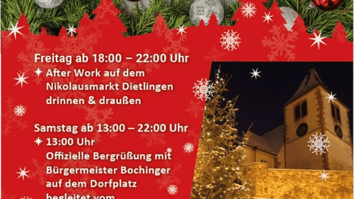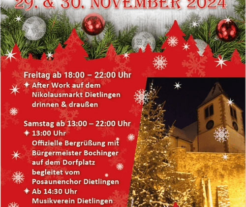 Der Nikolausmarkt in Dietlingen bietet ein vielfältiges Angebot an kulinarischen Köstlichkeiten und handwerklichen Schätzen. Genießen Sie Live-Musik mit einer Tasse Glühwein und lassen Sie den vorweihnachtlichen Zauber auf sich wirken. Erstmalig an zwei Tagen! Das vielfältige Angebot des Nikolausmarkts Dietlingen bietet eine breite Palette an kulinarischen Köstlichkeiten und handwerklichen Schätzen. Auf der Bühne gibt es Live-Musik gemäß dem Bühnenprogramm sowie köstlichen Glühwein von der Kelternwein-Kelterei. Verschiedene Anbieter verwöhnen die Besucher mit leckeren Hamburgern, Flammkuchen und Würsten. Zusätzlich finden sich Attraktionen wie eine Fotobox mit dem Weihnachtsmann, Zuckerspinnen und Süßigkeiten. Außerdem werden Produkte wie Honig, Honigwein, handgemachte Weidenkörbe, Misteln, Alpenkäse und Speckspezialitäten angeboten. Zudem bieten diverse Stände eine Vielzahl an dekorativen Geschenkideen, handgefertigtem Schmuck, Kleidung und vielem mehr. Die Palette reicht von Essens- und Trinkständen bis hin zu kunstvollen Geschenkartikeln, die jeden Besucher mit einer breiten Auswahl und Vielfalt erfreuen.