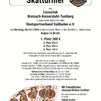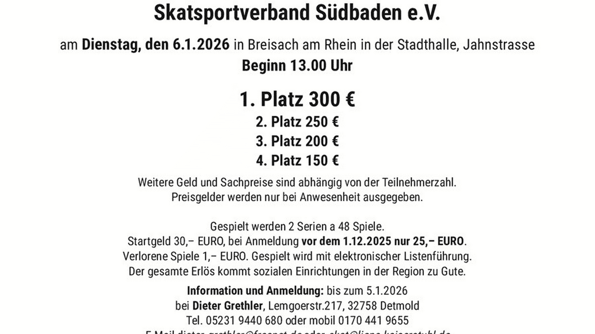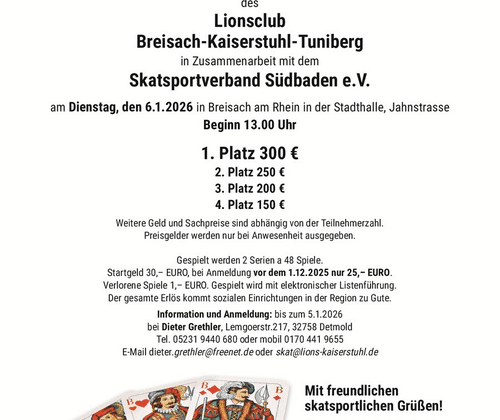 Der Lionsclub Breisach-Kaiserstuhl-Tuniberg in Zusammenarbeit mit dem Skatsportverband Südbaden e.V. lädt zum Skatturnier am Dienstag, den 06.01.2026 in Breisach am Rhein in der Stadthalle, Jahnstrasse. Großes Benefiz Skatturnier des Lionsclub Breisach-Kaiserstuhl-Tuniberg in Zusammenarbeit mit dem Skatsportverband Südbaden e.V. am Dienstag, den 06.01.2026 in Breisach am Rhein in der Stadthalle, Jahnstrasse Beginn 13.00 Uhr 1. Platz 300 € 2. Platz 250 € 3. Platz 200 € 4. Platz 150 € Weitere Geld und Sachpreise sind abhängig von der Teilnehmerzahl. Preisgelder werden nur bei Anwesenheit ausgegeben. Gespielt werden 2 Serien zu 48 Spielen. Startgeld 30,– EURO , verlorene Spiele 1,– EURO. Bei Anmeldung vor dem 1.12.2025 nur 25,– EURO. Gespielt wird mit elektronischer Listenführung. Der gesamte Erlös kommt sozialen Einrichtungen in der Region zu Gute. Information und Anmeldung: spätestens am 05.01.2026 bei Dieter Grethler , Lemgoerstr.217, 32758 Detmold Tel. 05231 9440 680 oder mobil 0170 441 9655 E-Mail dieter.grethler@freenet.de oder skat@lions-kaiserstuhl.de Mit der Turnieranmeldung erklärt sich jede/r Teilnehmer/in mit der Veröffentlichung personenbezogener Daten und eventueller Fotos, welche im Rahmen dieses Turniers erhoben bzw. gemacht werden, auf der Internetseiten des SKSV und in den Printmedien einverstanden Mit freundlichen skatsportlichen Grüßen! Eine gute Anreise und „Gut Blatt“ wünscht Stefan Surber Präsident des Lionsclubs Breisach-Kaiserstuhl-Tuniberg
