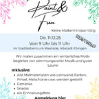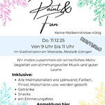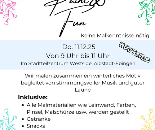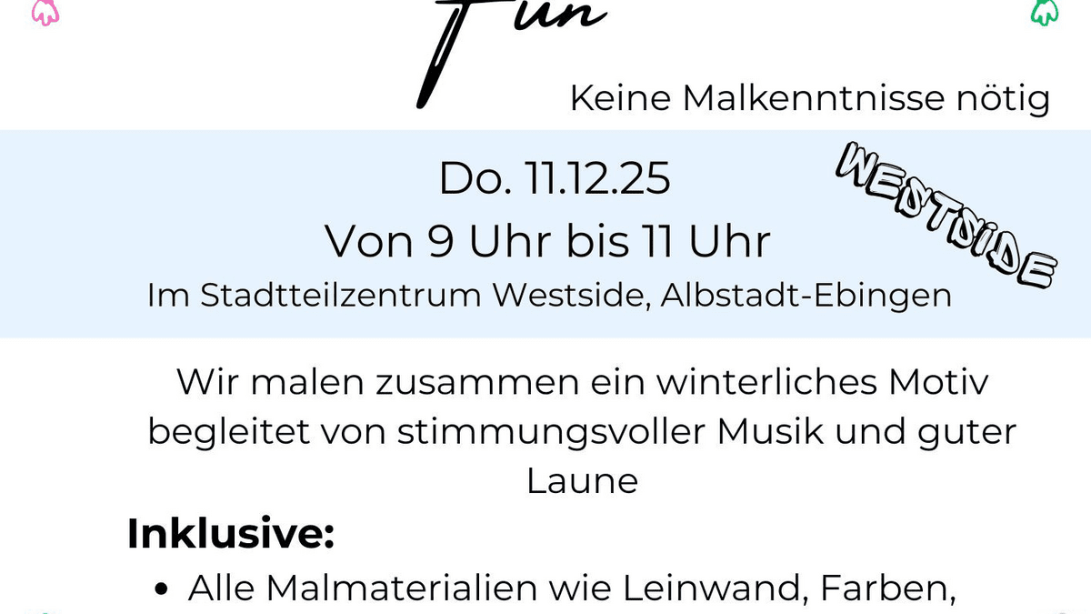 Am 11. Dezember 2025 lädt PartyPerfect zu einem kreativen Paint & Fun-Vormittag im Stadtteilzentrum Westside in Albstadt-Ebingen ein. Von 9 bis 11 Uhr malen wir gemeinsam ein winterliches Motiv – ganz ohne notwendige Vorkenntnisse. Begleitet wird das Event von stimmungsvoller Musik, guter Laune sowie Getränken und Snacks. Alle Malmaterialien sind inklusive, ebenso ein Erinnerungsfoto. Die Teilnahme kostet 12 €, eine Anmeldung ist per E-Mail oder WhatsApp möglich.