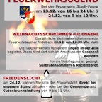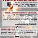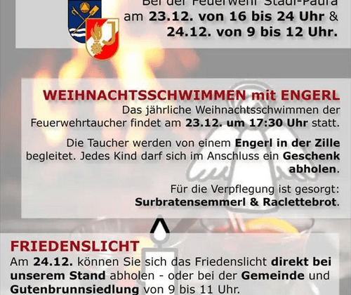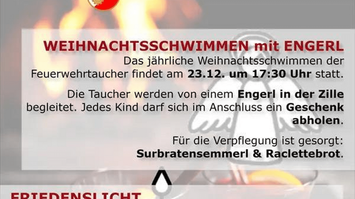 Weihnachtsschwimmen mit Engerl Das jährliche Weihnachtsschwimmen der Feuerwehrtaucher findet am 23.12. um 17:00 Uhr statt. Die Taucher werden von einem Engerl in der Zille begleitet. Jedes Kind darf sich im Anschluss ein Geschenk abholen. Für die Verpflegung ist gesorgt: Surbraten & Raclettebrot. FriedenslichtAm 24.12. können Sie sich das Friedenslicht direkt bei unserem Stand abholen - oder bei der Gemeinde und Gutenbrunnsiedlung von 9 bis 11 Uhr. Wir freuen uns auf Ihr Kommen und wünschen frohe Weihnachten und ein gutes neues Jahr!