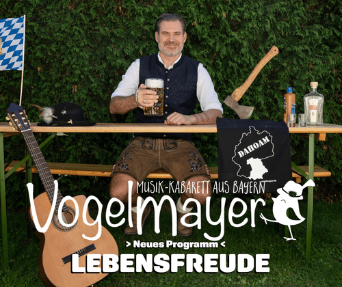 „LEBENSFREUDE“ – das neue Programm des Musik-Kabarettisten Vogelmayer Der Titel zur neuen Show vom Vogelmayer ist Programm! Wenn der Musik-Kabarettist mit seiner Gitarre dynamisch, gut gelaunt und wortstark die Bühne betritt, ist schnell klar: Der Vogelmayer IST pure „Lebensfreude!“ Seine narrischen Witze und Gstanzln 2.0 sprüht er ins Publikum wie eine dieser Silvester-Batterien, aus denen viele bunte Lachraketen schießen: mal frivol bayerisch kracherd, mal hinterfotzig derb, mal subtil hintersinnig: „Der Herr hat‘s Hirn regnen lassen, aber manche hatten anscheinend einen Schirm dabei“, resümiert er. Und hat das Publikum schon auf seiner Seite. Und das bis zum letzten Lacher in seiner tempo- und abwechslungsreichen Reise mitten durchs Leben: durch Herz, Hirn und Bauch. Der Vogelmayer gibt auf der Bühne alles, eine echte Rampensau mit toller Bühnenpräsenz, Hingabe und vollem Körpereinsatz. Er will seinen Gästen einen Abend voller Lebensfreude schenken, mit ihnen launige Stunden verbringen und sie dann glücklich in die Nacht entlassen. Gerade in diesen herausfordernden Zeiten. Dabei ist er nah dran am Publikum: fragt, kommentiert, plaudert mit einzelnen, begeistert mit seiner spontanen Schlagfertigkeit. Der Vogelmayer geht mit offenen Augen und Ohren durchs Leben, schnappt Themen und Stimmungen auf, die die Menschen umtreiben und bringt sie herrlich leicht, nie mit moralischem Zeigefinger, dafür mit viel Selbstironie und echter niederbayerischer Heimatliebe auf die Bühne. Und das alles in diesem herzwärmenden Dialekt! Voller Energie albert, philosophiert und zupft er sich durch den Abend. Manche doppeldeutigen Witze brauchen kurz, bis sie beim Publikum zünden und steigern in der Ruhe die Spannung. Zum Beispiel so valentinesk-absurde Einsichten wie: „Das Schwierige am Nixtun ist, dass‘d net weißt, wanns‘d fertig bist.“ Sein Publikum liebt ihn: „Du machst a hauf'n Leit ganz vui Freid!“ liest oder hört er öfters.