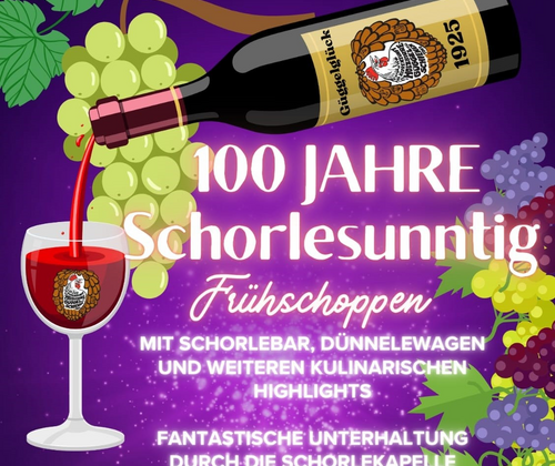 100 Jahre Schorlesunntig 11 Uhr im Güggelpalast Fantastische Unterhaltung durch die Schorlekapelle Schienerberg Mit feierlicher Amtseinführung des Schorleministers mit Schorlebar, Dünnelewagen und weiteren kulinarischen Higlights