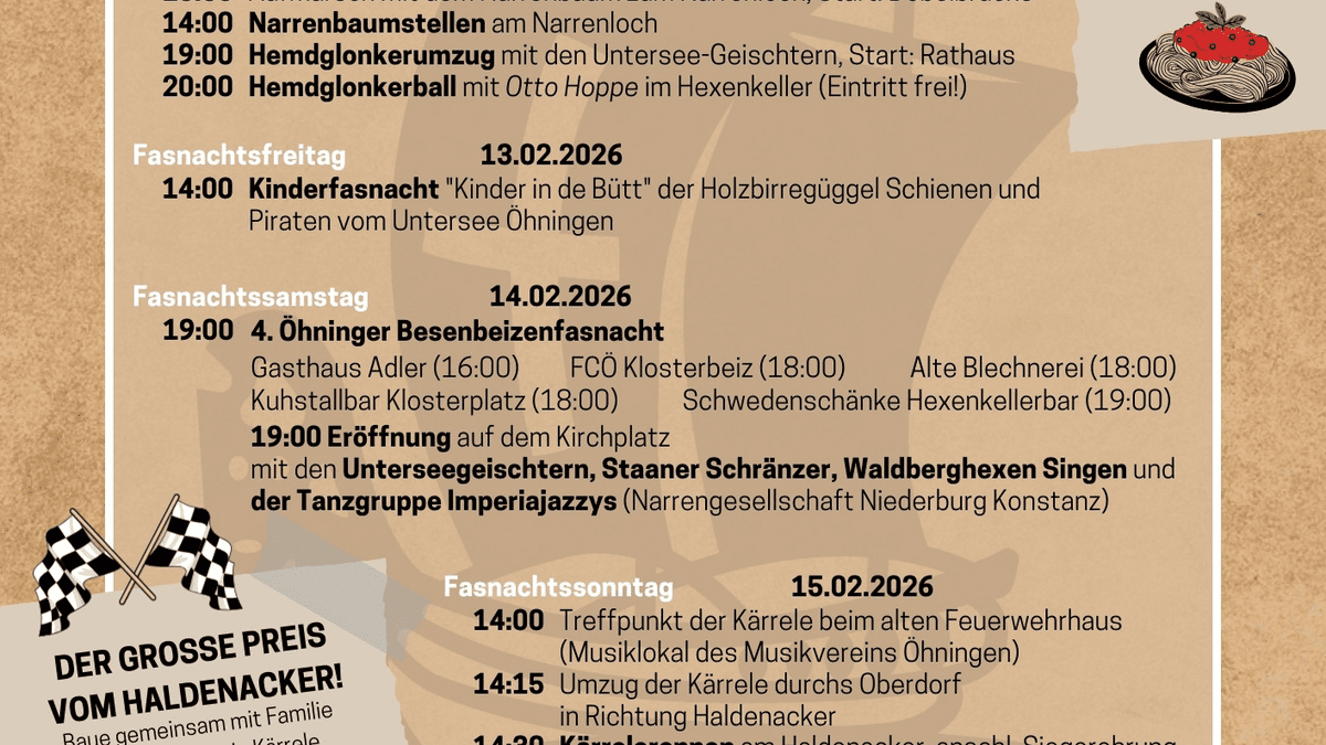 14:00 Narrenbaumfällen mit Bewirtung im Kuhstall 19:00 Letzter Umzug durchs Dorf mit den Unterseegeischtern und Fastnachtsverbrennen 20:00 Schlussrummel im Hexenkeller Eintritt frei !