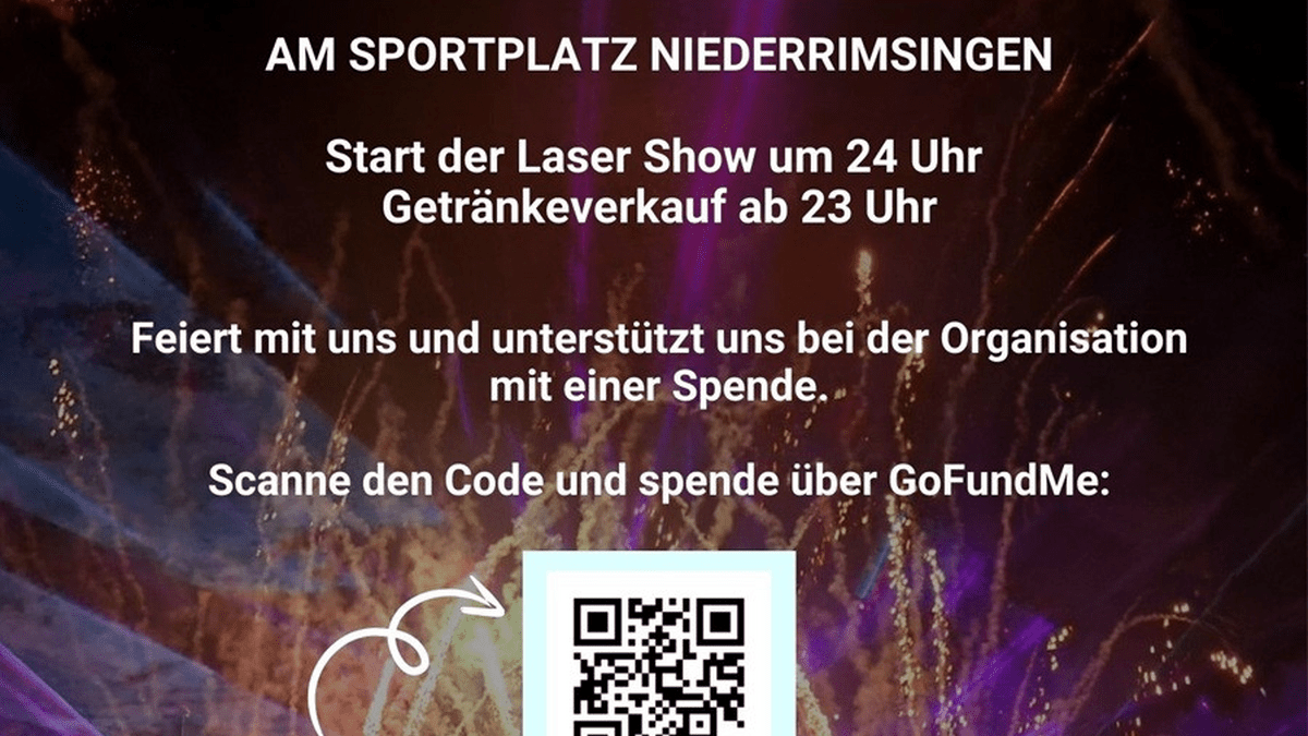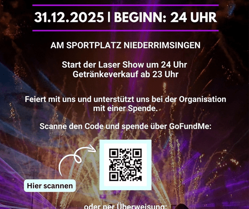 Lasst uns das neue Jahr mit Licht und Feuerwerk begrüßen. Die Vereinsgemeinschaften Ober- und Niederrimsingen laden ein das neue Jahr mit einer Lasershow und einem Feuerwerk zu begrüßen. Für das leibliche Wohl ist gesorgt. Die Veranstaltung kostet keinen Eintritt, es wird jedoch um Spenden gebeten. Vereinsgemeinschaft Oberrimsingen e.V Sparkasse Staufen Breisach IBAN: DE03 6805 2328 0006 1314 60 Verwendungszweck: Lasershow