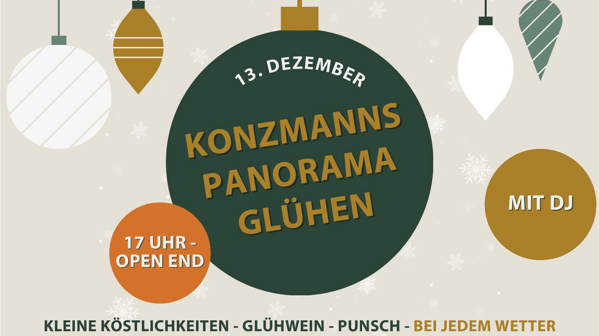 Wenn’s draußen kalt wird, machen wir’s euch so richtig gemütlich: Bei „Konzmanns Panorama Glühen“ im Weingut Konzmann genießen wir den Winter mit Blick über die Reben! Wenn’s draußen kalt wird, machen wir’s euch so richtig gemütlich: Bei „Konzmanns Panorama Glühen“ im Weingut Konzmann genießen wir den Winter mit Blick über die Reben! Freut euch auf stimmungsvolle Lichter, winterliche Deko und ein heißes Highlight. Unser DJ sorgt mit lässigen Beats für die perfekte Stimmung – Glühwein in der Hand, Musik im Ohr und Aussicht deluxe – besser geht’s nicht! Natürlich ist auch für wärmenden Genuss gesorgt mit hausgemachtem Glühwein & Punsch, winterlichen Spezialitäten aus unserem Sortiment und kleinen Köstlichkeiten „auf die Hand“ – herzhaft, lecker, unkompliziert. Kommt vorbei, bringt eure Freunde und gute Laune mit und lasst euch bei „Konzmanns Panorama Glühen“ von Winterzauber und Panoramablick verzaubern!
