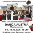 MUSIK UND GESCHICHTSERZÄHLUNG (FOLGE 1) IN DER STADTBÜCHEREI BRAUNAU Samstag, 13. Dezember 2025, 18:00 Uhr Für Samstag, 13. Dezember 2025, 18:00 Uhr, laden wir herzlich zur Veranstaltungsreihe „Musik und Geschichtserzählung“ (Folge 1) ein! Unter dem Motto „Geschichte(n) auf Schritt und Tritt“ erzählen die Heimatforscher Tamara und Manfred Rachbauer die Geschichten zur Geschichte aus der Stadt am Inn, ergänzt von der inspirierenden Musik des Kulturbotschafters Musikensembles DANICA-AUSTRIA. Wo: Stadtbücherei Braunau am Inn, Palmplatz 8, 5280 Braunau am Inn Der Eintritt ist frei! Beste Unterhaltung garantiert! Reservierung erforderlich!