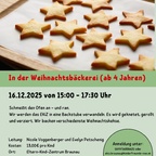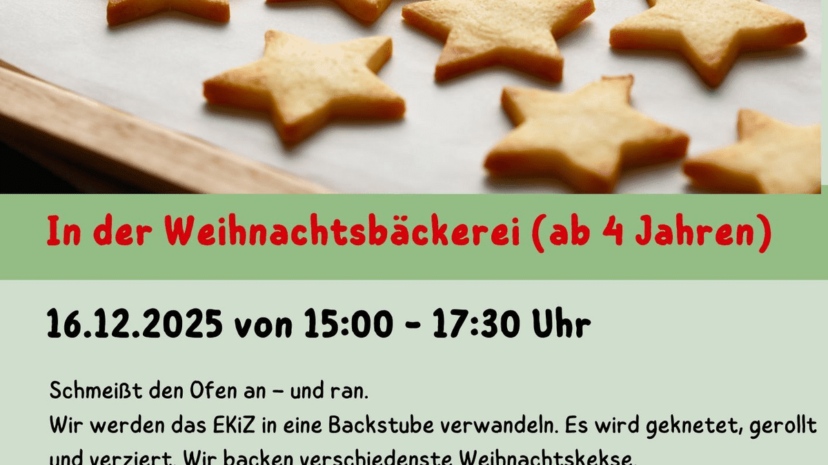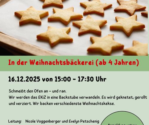 IN DER WEIHNACHTSBÄCKEREI Dienstag, 16. Dezember 2025, 15:00 – 17:30 Uhr Schmeißt den Ofen an und ran! Wir werden das EKiZ in eine Backstube verwandeln. Es wird geknetet, gerollt und verziert. Wir backen verschiedenste Weihnachtskekse. Leitung: Nicole Voggenberger und Evelyn Petschenig Kosten: 13,00 Euro pro Kind Info unter +43 699 168 866 20 oder unter: ekiz.braunau@kinderfreunde.at