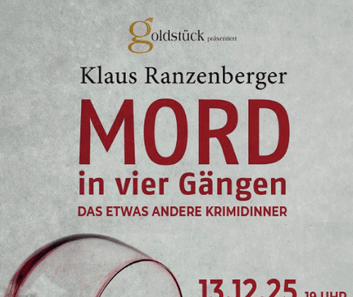 MORD IN VIER GÄNGEN DAS ETWAS ANDERE KRIMIDINNER Samstag, 13. Dezember 2025 ab 19:00 Uhr Mord in vier Gängen: Das etwas andere Krimidinner. Musik, Wein und 4-Gang-Menü aus dem Buch des berühmten Braunauer Schriftstellers Klaus Ranzenberger, von ihm gelesen und von uns im Goldstück serviert. Teilnahme nur mit Reservierung.
