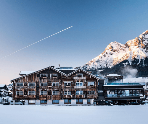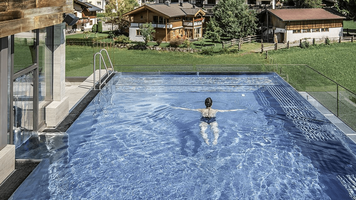 Auf dem Dach erwarten die Gäste ein Infinity-Pool und eine Panorama-Sauna mit atemberaubendem Blick auf die Hochkönig-Berge.