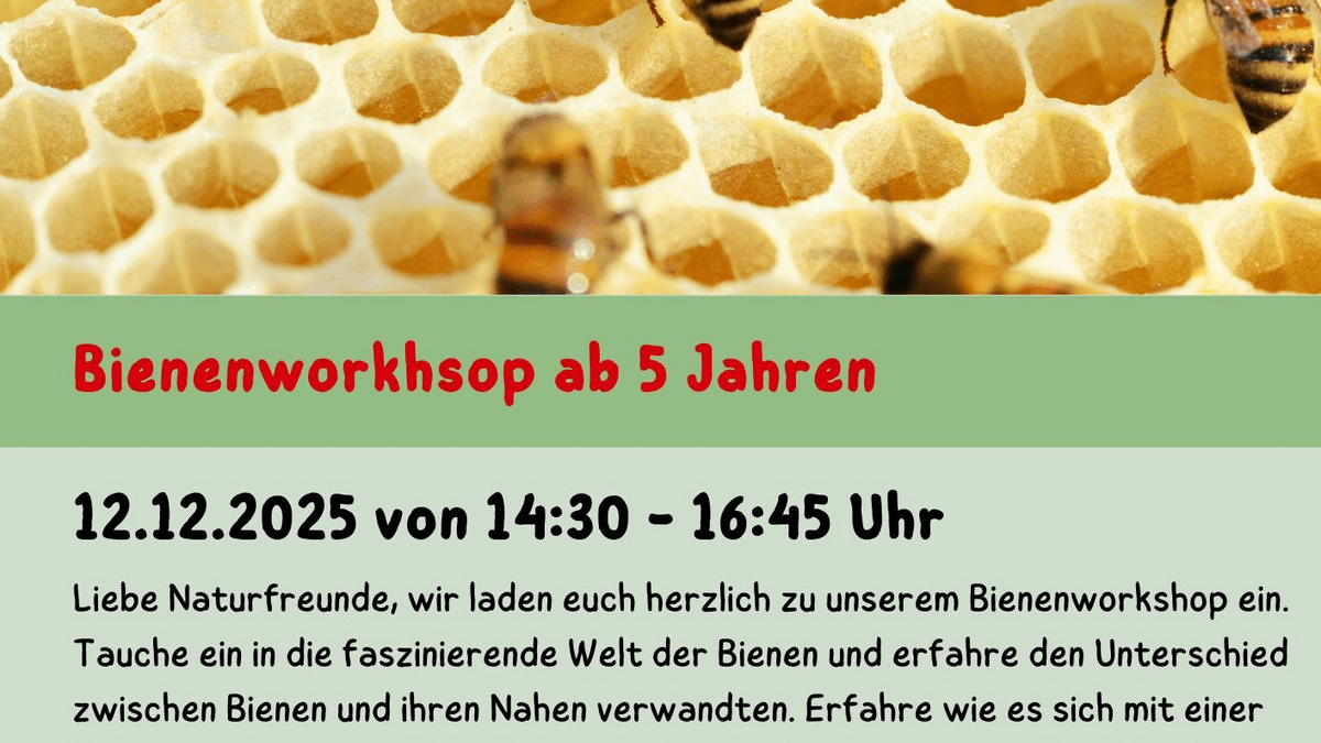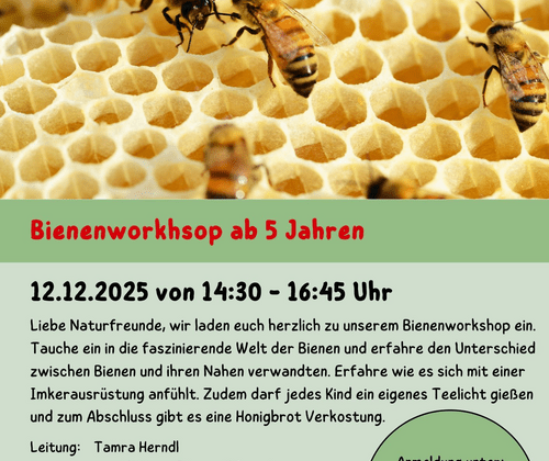 BIENENWORKSHOP AB 5 JAHREN Freitag, 12. Dezember 2025 14:30–16.45 Uhr Liebe Naturfreunde, wir laden euch herzlich zu unserem Bienenworkshop ein. Tauche ein in die faszinierende Welt der Bienen und erfahre den Unterschied zwischen Bienen und ihren nahen Verwandten. Erfahre wie es sich mit einer Imker-Ausrüstung anfühlt. Zudem darf jedes Kind ein eigenes Teelicht gießen und zum Abschluss gibt es eine Honigbrot-Verkostung. Leitung: Tamara Herndl, zertifizierte Bienenpädagogin Kosten: 16,00 Euro pro Kind Info unter +43 699 168 866 20 oder unter: ekiz.braunau@kinderfreunde.at
