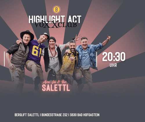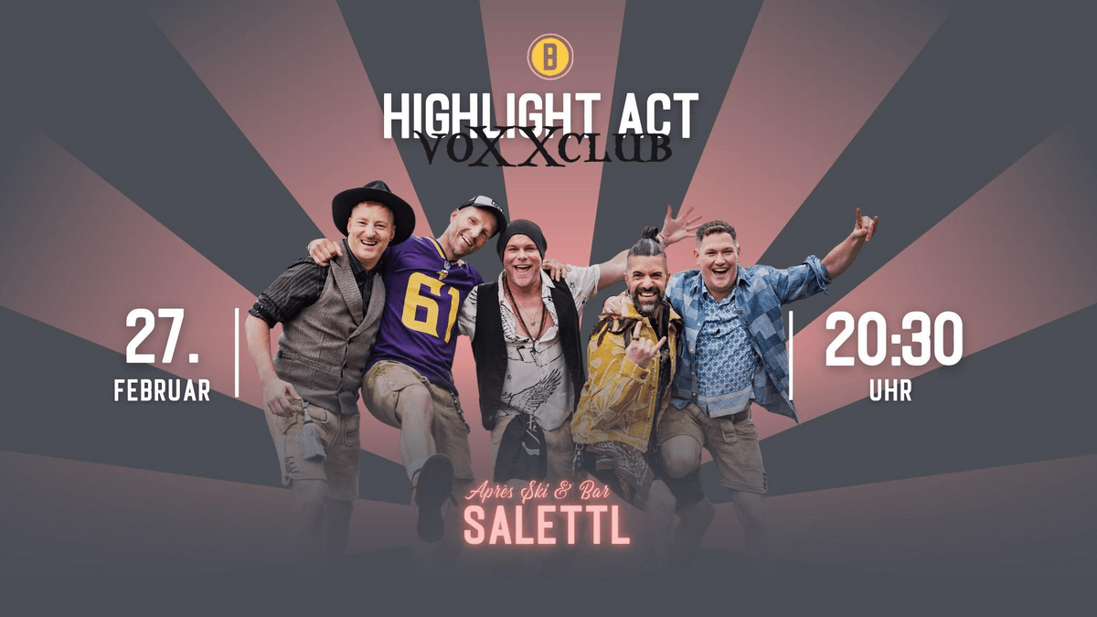 Fünf Stimmen, eine Show und ein Highlightauftritt voller Energie: voXXclub verbindet Volksmusik mit modernen Beats und Pop-Sounds. Mit ihren energiegeladenen Auftritten und mitreißenden Songs sind sie eine der beliebtesten Gruppen in der deutschen Musikszene. Komm vorbei, feier mit uns und erlebe echte Power. Stimmung garantiert!