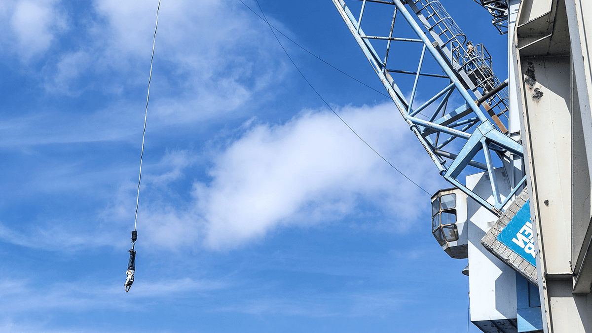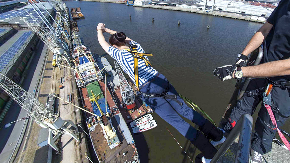 Adrenalinkick für ein jumptastisches Team Ihr steht auf der Spitze des Hafenkrans. 50 Meter über dem Boden. Mit atemberaubendem Blick auf Elbe und Schiffe. Auf eurem Körper bildet sich schon eine Gänsehaut. Euer Herz pocht wie verrückt. In diesem Moment hört ihr ein dumpfes: Ready? Ihr macht euch bereit zum Sprung – und schon stürzt ihr in die Tiefe. Beim Tandem Bungeejumping in Hamburg habt ihr die Möglichkeit, eure Körper in andere Dimensionen zu versetzten. Testet eure Grenzen und wagt den Fall in Richtung Wasser. Springt aus dem Alltag mit dem Tandem Bungeejumping in Hamburg. Inhalt Tandem Bungee Jump aus 50 m Höhe von einem Hafenkran Urkunde Einweisung und Betreuung durch einen erfahrenen Instruktor Professionelle Leihausrüstung Teilnehmer Gutschein gültig für 2 Personen Dauer Ca. 1,5 Stunden Ausrüstung & Kleidung Mitzubringen: Sportliche, bequeme Kleidung und festes, knöchelfreies Schuhwerk Wird gestellt: Sicherheitsausrüstung  Teilnahmebedingungen Mindestalter: 16 Jahre  Normale physische und psychische Verfassung Gewicht: mind. 50 kg, max. 118 kg  (inkl. Kleidung und Schuhwerk) Max. Gesamtgewicht: 165 kg Unterschriebener Haftungsausschluss