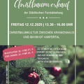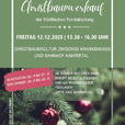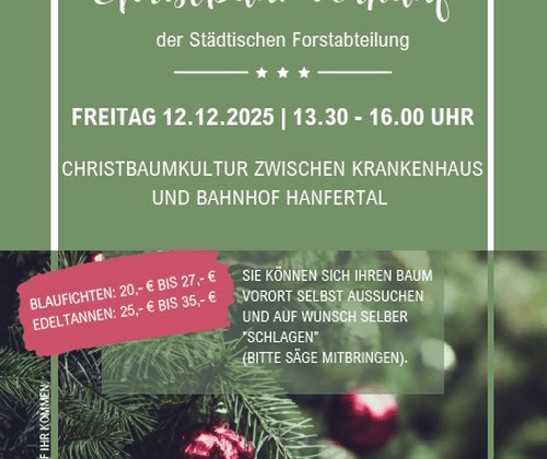 Christbaumverkauf der Städtischen Forstabteilung Freitag 12.12.2025 von 13.30 - 16 Uhr in der Christbaumkultur zwischen Krankenhaus und Bahnhof Hanfertal Sie können sich Ihren Baum Vorort selbst aussuchen und auf Wunsch selber "schlagen" (in diesem Fall bitte Säge mitbringen). Blaufichten: 20€ bis 27€ Edeltannen: 25€ bis 35€ Die Forstabteilung freut sich auf Ihr Kommen!