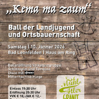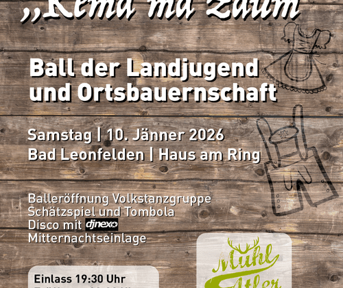 Kema ma zaum - Ball der Landjugend und Ortsbauernschaft Bad Leonfelden Samstag 10. Jänner 2026 / Haus am Ring, Bad Leonfelden - Balleröffnung Volkstanzgruppe - Schätzspiel und Tombola - Disco - Mitternachtseinlage Einlass: 19.30 Uhr - Eröffnung 20.30 Uhr VVK: € 10,- | AK.€ 12;-
