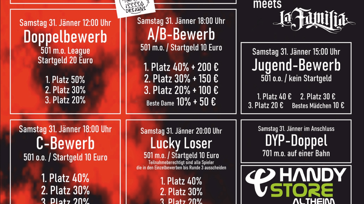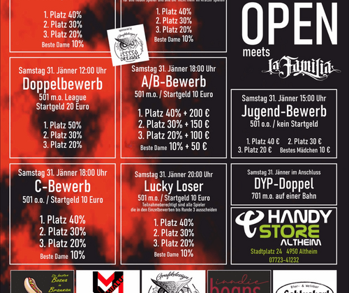 LA FAMIGLIA – WINTER DART OPEN Freitag, 30. & Samstag, 31. Januar 2026 Freitag: ab 19:00 Uhr Samstag: ab 12:00 Uhr Freitag, 30. Januar 2026 19:00 Uhr Kratzerbewerb 21:00 Uhr offenes Einzel Samstag, 31. Januar 2026 12:00 Uhr Doppelbewerb 15:00 Uhr Jugendbewerb 18:00 Uhr A/B/C-Bewerb 20:00 Uhr Lucky Loser DYP – Doppel im Anschluss