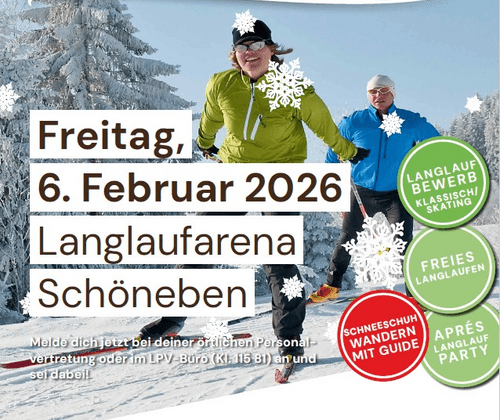 Langlauf-Bewerb - Klassisch & SkatingFreies LanglaufenSchneeschuh-Wandern mit GuideAprés Langlauf Party