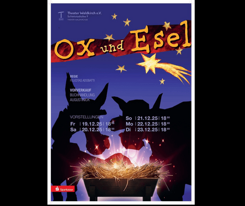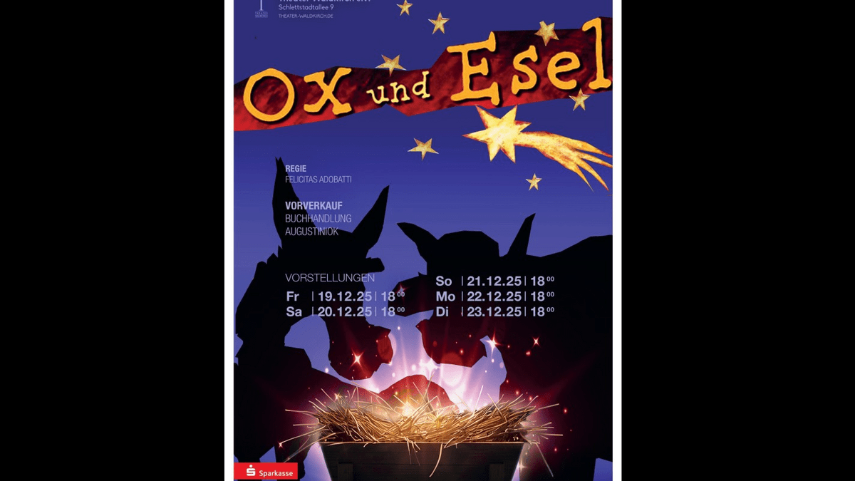 Das Theater Waldkirch e.V. bringt die Weihnachtsgeschichte aus Sicht des Ochsen und des Esels für Kinder ab 5 Jahren im Theater im Milliongässli auf die Bühne. In diesem Jahr präsentiert das Theater Waldkirch e. V. die Weihnachtsgeschichte aus einem neuen Blickwinkel. Die meisten Menschen kennen wohl die klassische Weihnachtsgeschichte von Maria und Josef, die deren Reise von Nazareth nach Bethlehem und schließlich die Geburt Jesu im Stall erzählt. Eigentlich ist dieser Stall das zu Hause des Ochsen und des Esels, die jedoch meist nur als Statisten im Hintergrund stehen dürfen. Und nun rücken sie in den Vordergrund und erzählen die Geschichte aus ihrer Perspektive: Nach einem langen Arbeitstag kommen sie nach Hause und freuen sich auf ihr Abendessen. Doch auf dem Heu des Ochsen liegt ein Menschenkind, ganz alleine, ohne seine Eltern. Die beiden sind etwas ratlos und dann beginnt das Baby auch noch zu weinen. Die beiden überlegen, was zu tun ist. Diese kleine, amüsante Weihnachtsgeschichte ist besinnlich und lustig zugleich, hat viel Sprachwitz, turbulente Momente und wird von den beiden Schauspielern Willi Jacke (Ox) und Christian Schönhoff (Esel) gespielt. Zusammen mit der Musikerin Wiebke Reichardt (Kind) ist eine kleine, ganz besondere Theaterinszenierung entstanden. Das Stück richtet sich an Kinder ab 5 Jahren und alle Erwachsenen, die sich eine Stunde Pause vom Weihnachtsrummel einräumen möchten. Aufführungen sind am 19./20./21./22. und 23.12.25 von 18 bis 19 Uhr. Karten gibt es im Vorverkauf in der Buchhandlung Augustiniok und an der Abendkasse.