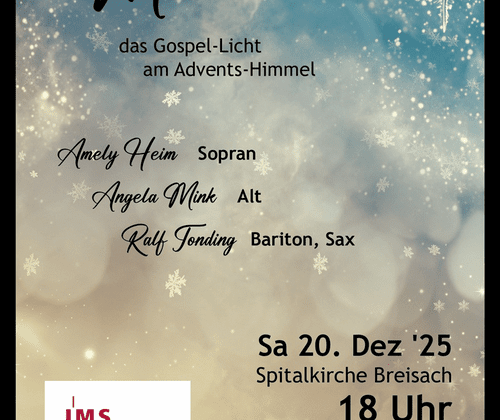 Sopran: Amely Heim Alt: Angela Mink Bariton: Ralf Tonding Drei Musik-Profis lassen am Samstag, 20. Dezember, 18.00 Uhr in der Spitalkirche Breisach gemeinsam ihre Liebe zur weihnachtlichen Musik ertönen. Der strahlende, glasklare Sopran von Amely Heim, die sinnliche, bluesige Altstimme von Angela Mink und der charmante, profunde Bariton von Ralf Tonding ergänzen sich aufs Beste. Ukulele, Klavier und Saxophon sind die instrumentalen Zutaten zu einem abwechslungsreichen Konzert mit romantischen Melodien bekannten und unbekannten Weihnachtssongs bis zum fetzigen Gospel. Der Eintritt ist frei, um Spenden wird gebeten