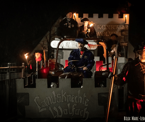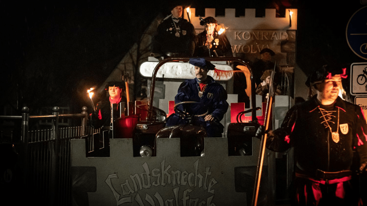 Mit großem Gefolge zieht Graf Konrad durch die Stadt und verkündet "ein siebentägiges Fest" für die Narren. Das Fasnet-Ausrufen ist der erste der zwölf Wolfacher Umzüge. Die Fackeln der Landsknechte verbreiten eine ganz besondere Stimmung bei diesem abendlichen Spektakel. Anschließend "Narrenhock" in der Schlosshalle und den Lokalen.