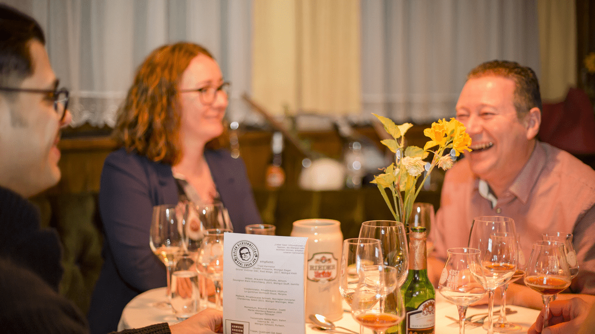 A-Bier-itif7-gängiges Menü begleitet von harmonisch kombinierten "großen Werken" der Winzer und BrauerAls krönenden Abschluss servieren wir noch einen "Kracher" der Bier- und Weinwelt zur Praline