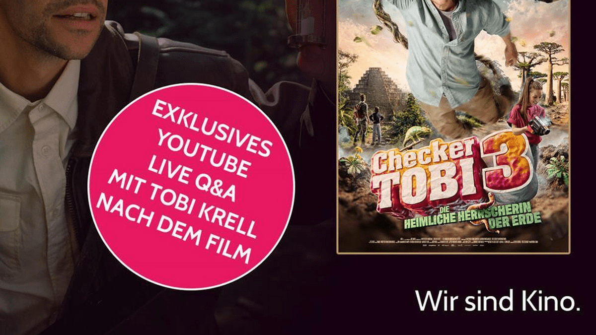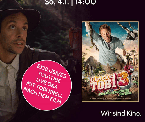 Am Sonntag, den 04.01.2026 zeigen wir euch nicht nur die Familienpremier von CHECKER TOBI 3 – DIE HEIMLICHE HERRSCHERIN DER ERDE, sondern direkt im Anschluss an die Filmvorführung auch ein exklusives Live Q&A mit Tobi Krell alias Checker Tobi über Youtube, moderiert von Dominik Porschen, aus dem Zoo Palast Berlin!