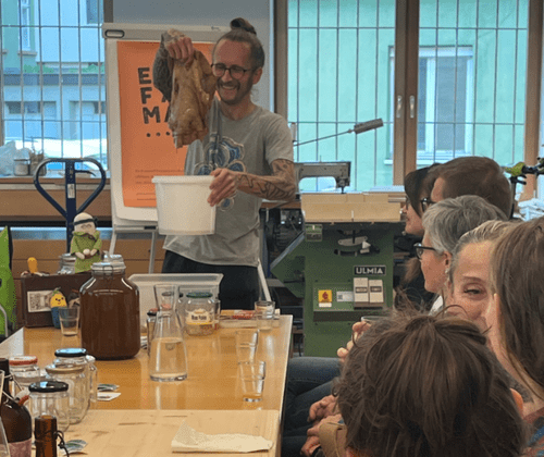 Der neue Fermentier-Stammtisch im "Haus am Katzenturm" bietet eine Plattform für Austausch für alle, die schon aktiv Getränke, Sauerteig, Kimchi und Co. fermentieren. Ein gemütlicher Abend mit Getränken und Snacks, Sanjay Bösch ist für Fragen und Austausch vor Ort und es können auch gerne übrige „Haustierchen“ wie Sauerteigansatz oder eine Kombucha-Mutter mitgebracht und untereinander getauscht werden.