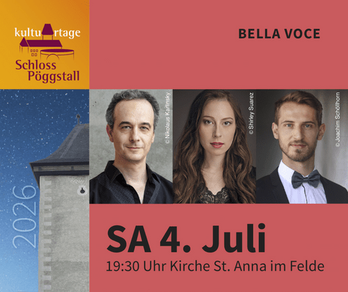Lassen Sie uns gemeinsam auf den berauschenden Wellen und Klängen slawischer Arien und Melodien dahingleiten – die pittoreske Kirche St. Anna im Felde nächst Pöggstall mit den unvergesslichen Sonnenuntergängen, die sich in ihren bunten Glasfenstern spiegeln, wird wieder zum Schauplatz romantischer musikalischer Reisen, mit Werken u.a. von Tschaikowsky, Mussorgsky, Dvorak und Smetana – dargeboten vom Pöggstall Liebling Kammersänger Adrian Eröd und seinen diesjährigen Gästen: Maja Tiler/Sopran und Philipp Schöllhorn/Bass, sowie dem bewährten United Europe Orchester unter der Leitung von Elena Rozanova.
