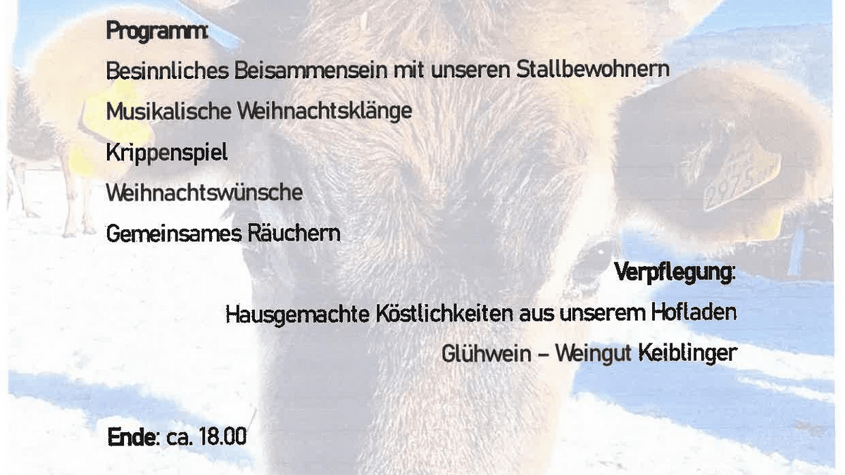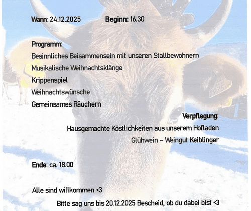 Freut euch auf: Besinnliches Beisammensein mit unseren Stallbewohnern Musikalische Weihnachtsklänge Krippenspiel Weihnachtswünsche Gemeinsames Räuchern Damit niemand Hungrig bleiben muss, gibts hausgemachte Köstlichkeiten aus dem Hofladen und Glühwein vom Weingut Keiblinger. Ende ist um ca. 18:00 Uhr Alle sind willkommen. Bitte sagt bis 20.12.2025 Bescheid, ob ihr gerne an dieser Weihnacht teilnehmen möchtet.