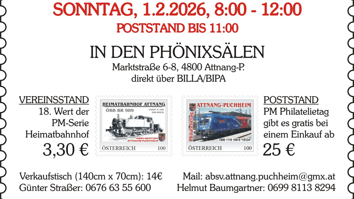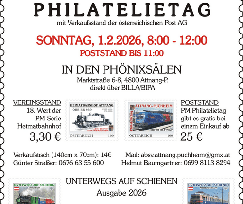 Weiters wird vom Verein ein neuer Wert der personalisierten Briefmarkenserie ,,Heimatbahnhof Attnang" verausgabt und bisherige Marken, Briefe und Sonderstempel zum Verkauf angeboten.