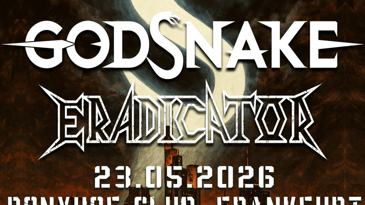Gerade kehrt die moderne Melodic-Thrash-Metal-Band GODSNAKE aus Hamburg mit der neuen und eigenständigen Single „No Happy End“ zurück, da kündigen sie schon ein Gastspiel der Main-Metropole Frankfurt an! Am 23.05.2026 laden die Nordlichter in den stadtbekannten Ponyhofclub in der Klappergasse, um ihr bis dahin kommendes 3. Studioalbum live zu präsentieren.