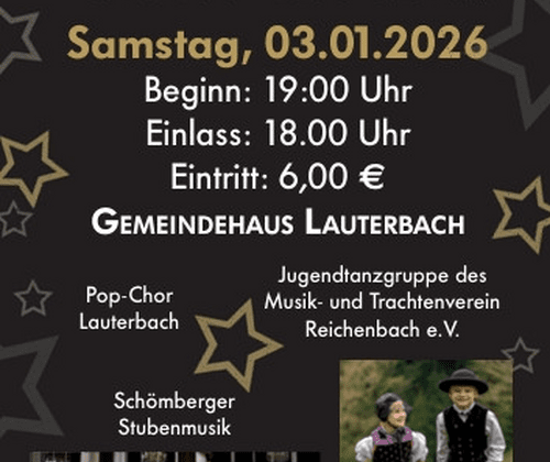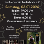Auch in diesem Jahr lädt der Trachtenverein Lauterbach e.V. wieder zu seinem Heimatabend ein. Das bunte Programm wird gestaltet durch die Schömberger Stubenmusik, die Jugendtanzgruppe des Musik- und Trachtenverein Reichenbach, den Pop-Chor Lauterbach, sowie die gemischte Tanzgruppe des Trachtenverein Lauterbach und des Historischen Verein Hornberg. Vor- in der Pause- und nach dem Programm werden sie mit Unterhaltungs- und Tanzmusik durch das Duo "Siggi & Bob" , bestens Unterhalten. Für das leibliche Wohl sorgt die Narrenzunft Lauterbach. Wir freuen uns auf viele Gäste. In der Pause wird es wieder unsere beliebte Tombola geben.