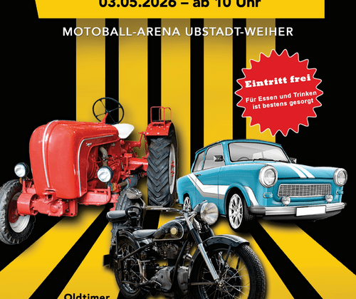 Oldtimertreffen des MSC Ubstadt-Weiher am 3. Mai 2026 ab 10 Uhr in der Motoball-Arena. Historische Fahrzeuge, Essen & Trinken vorhanden. Familienfreundliches Event für Liebhaber klassischer Fahrzeuge. Erleben Sie automobile Geschichte hautnah! Am Sonntag, den 03. Mai 2026, lädt der MSC Ubstadt-Weiher alle Liebhaber klassischer Fahrzeuge zum beliebten Oldtimertreffen in die Motoball-Arena ein. Ab 10:00 Uhr erwartet Sie eine faszinierende Ausstellung historischer Fahrzeuge – vom eleganten Klassiker bis zum robusten Nutzfahrzeug. Tauchen Sie ein in die Welt vergangener Jahrzehnte und genießen Sie das besondere Flair der Motoball Arena.. Für das leibliche Wohl ist selbstverständlich bestens gesorgt. Ob Jung oder Alt – dieses Event verspricht einen unvergesslichen Tag für die ganze Familie. Kommen Sie vorbei und lassen Sie sich begeistern!
