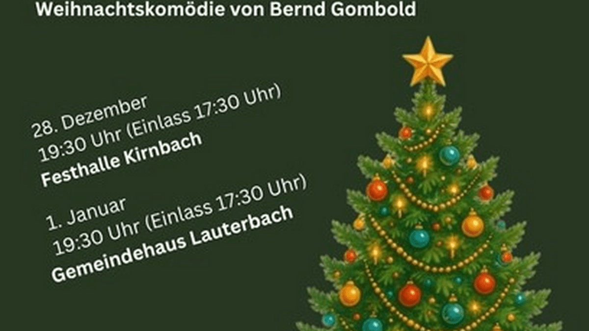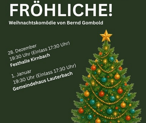 Dieses Jahr ist es endlich wieder so weit, wie alle zwei Jahre findet das Theater des Junggesellenvereins Sulzbach statt. Mit dem Stück „Ach, du Fröhliche!“ wollen die Theaterspieler/innen unter der Regie von Sarah Öhler Ihnen einen unterhaltsamen Abend bieten. In dem Theaterstück von Bernd Gombold findet bei Familie Maier ein chaotischer Heiligabend statt, bei dem sich die Ereignisse und Missverständnisse überschlagen. Am Ende kann dann aber doch wieder gelacht werden und einem versöhnlichen Weihnachtsabend steht nichts mehr im Weg. Lassen Sie sich von den Theaterspieler/innen begeistern und genießen Sie den Abend bei leckeren Speisen und Getränken. Der Junggesellenverein Sulzbach und die Theaterspieler/innen freuen sich auf Ihr Kommen … … am Sonntag, 28.12.2025 in der Festhalle in Kirnbach … am Donnerstag, 01.01.2026 im Gemeindehaus in Lauterbach