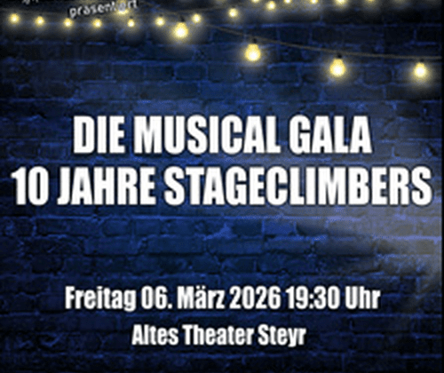 Feiern Sie mit uns das 10-jährige Jubiläum der Stageclimbers bei einer mitreißenden Musical Gala im Alten Theater Steyr. Freuen Sie sich auf die schönsten Musicalmelodien aus vergangenen Produktionen sowie auf weitere musikalische Highlights aus der Welt des Musicals.