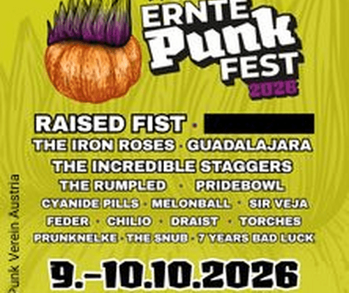 Am 9. und 10. Oktober 2026 wird die Messe Graz (Halle E) zum lautesten Ort der Stadt: Das ErntePUNKfest geht in die nächste Runde und hebt das Level in neue Gefilde. Mit Raised Fist kommt der bisher größte Headliner der Festivalgeschichte nach Graz. Die schwedischen Hardcore-Legenden stehen seit Jahren für kompromisslose Energie, brachiale Live-Shows und eine Wucht, die du nicht nur hörst, sondern körperlich spürst. Wer sie schon einmal live erlebt hat, weiß: Das ist kein Konzert, das ist ein Ausnahmezustand.