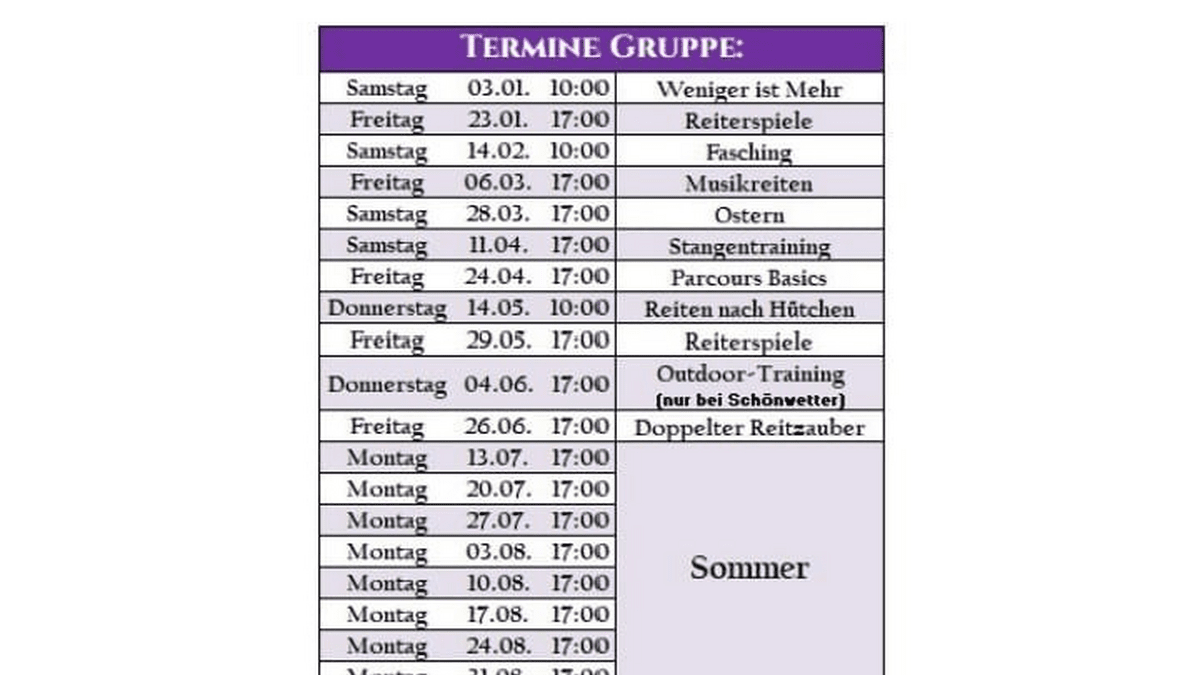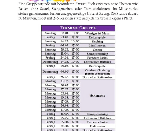Eine Gruppenstunde mit besonderen Extras: Euch erwarten neue Themen wie Reiten ohne Sattel, Stangenarbeit oder Turnierlektionen. Im Mittelpunkt stehen gemeinsames Lernen und gegenseitige Unterstützung. Die Stunde dauert 50 Minuten, findet mit 2–6 Personen statt und jeder reitet sein eigenes Pferd.